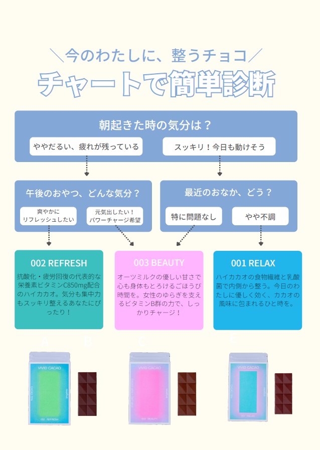 VIVID CACAO(ビビッドカカオ)は、低GIのアガベシュガーを使用し、現代の食生活で不足しがちなビタミン類を、チョコレートを楽しみながら無理なく取り入れられるウェルネスチョコレートです。